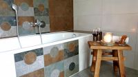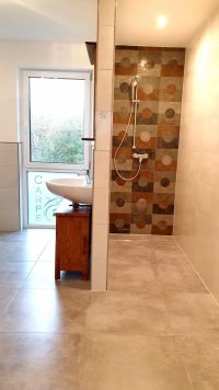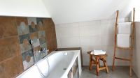 große begehbare Dusche, Badewanne, WC, Waschbecken und Fön.