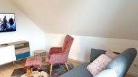 Wohnzimmer: mit TV-Board großer Wand-Flachbildschirmfernseher, Sessel mit Hocker, Ausziehcouch mit Schlafgelegenheit für 1-2 Personen sowie Couchtisch.