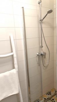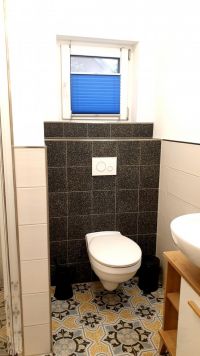 Tageslicht Badezimmer: Dusche, WC, Waschbecken und Fön.