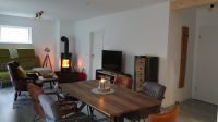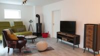 TV-Board mit großem Flachbildschirmfernseher, Sessel mit Hocker, Ausziehcouch mit Schlafgelegenheit für 1-2 Personen sowie Couchtisch.